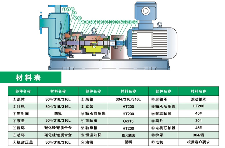 2.泵體、泵蓋、葉輪等過流部件均采用優(yōu)質(zhì)不銹鋼或特殊材料制造;