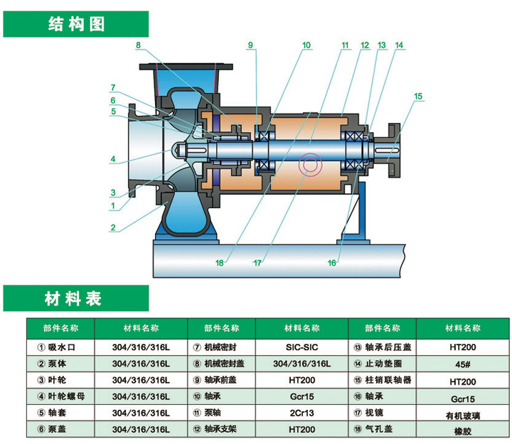 3.泵體、葉輪、后蓋、軸封箱、軸套、軸保護套、節(jié)流環(huán)、葉輪罩等過流件主要材料采用1Ci13Ni9Ti、316、316L、ZG20#、C4鋼、CD4MCu、蒙乃爾合金、哈氏C-276、904L、鈦合金、耐熱耐磨鋼等材料供不同的工況條件選用。